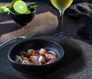 Si el menú hace un guiño a la gastronomía internacional, la Manzanilla también es una gran elección. Tanto si China es la inspiración de los platos como si viajamos a México o Perú, el vino hace brillar platos como los Dim Sum con diferentes rellenos, el ceviche o los jalapeños, para potenciar el ácido o el picante.